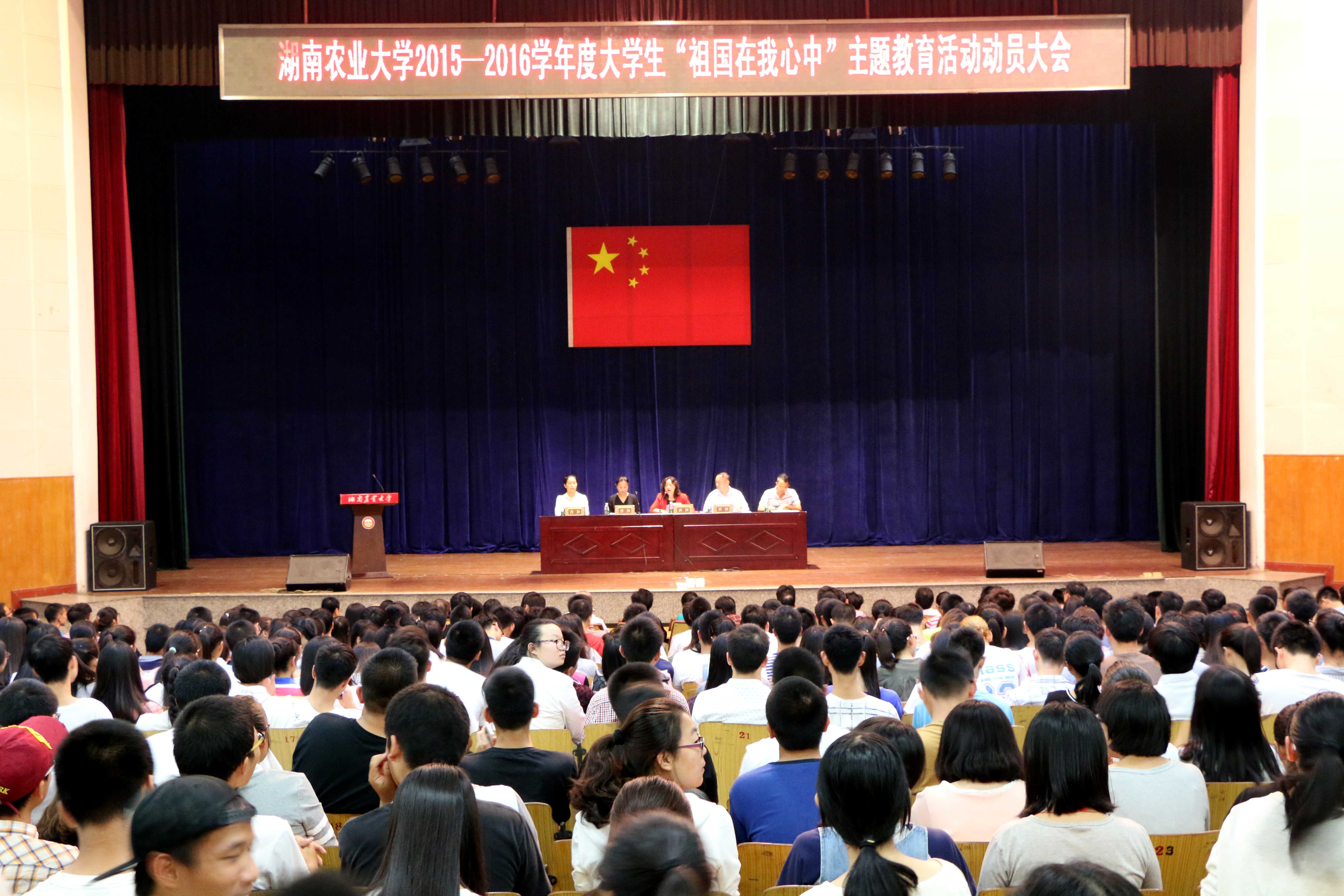 10月21日晚7点,各学院党委副书记、分团委书记,校关工委全体成员,二级关工委全体老同志以及各年级学生班团支部书记1000余人齐聚学校大礼堂,参加湖南农业大学2015—2016学年度“祖国在我心中”主题教育活动动员大会。张立副校长、彭克勤督导以及宣传部、学工部、校团委相关领导参加了动员大会。大会由张立副校长主持。