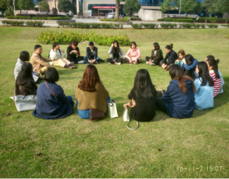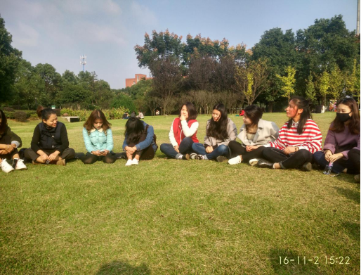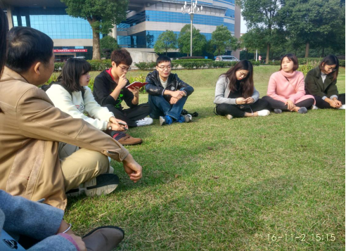 11月2日,阴霾了许久的天气终于放晴,院关工委常务副主任李雁老师与14级日语2班的同学在图书馆前的芙蓉广场草坪进行了党章学习活动。